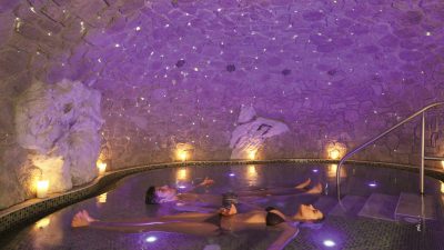 8 sauna and steam bath variations plus a fully glazed Sky Sauna (from Winter 2025); 15 m outdoor infinity pool (31 °C) and 20 m indoor infinity pool (31 °C); whirl loungers and massage loungers; shower path with ice fountain; Sky sun terrace with loungers (year-round); natural swimming pond and new bathing lake (summer); Relax Lounge with fireplace, Relax Oases with waterbeds and floating loungers.