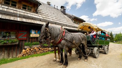 Die kleine Alm am Fuße des Karecks wurde in den 50ern errichtet und war zunächst ein Viehstall. Zum großen Glück der Spaziergänger, Wanderer und Schlittenfahrer, wurde der Stall 1991 zur Gasthütte mit 60 Sitzplätzen umgewandelt. Auf der schönen Sonnenterrasse wird zu den gschmackigen Gerichten ein weiter Ausblick über das Naturschutzgebiet gereicht. Ganz nach dem Motto „auf da Alm da gibt’s ka Sünd“ gibt es hier Herzhaftes wie die Pritzjausenplatte und Fleischnudeln (gefüllte Nudelteigtaschen) und Süßes wie gefüllte Bauernkrapfen und Germknödel.