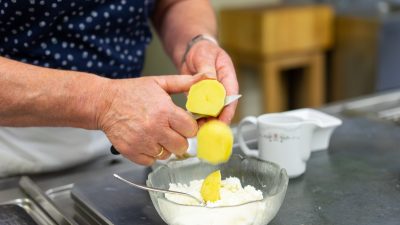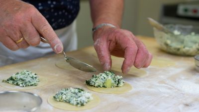 Slow-Food: Wenn Waltraut Trenker in der Küche des Wanderhotels Trenker ihre allseits beliebten Tirtlan mit Topfen und Blattspinat-Füllung zum Frittieren in heißes Öl gibt, vergeht nur noch eine kurze Zeit vor dem großen Genuss. Sobald die goldgelben Teigtaschen fertig gebacken sind, gibt es kaum noch ein Halten bei Familie und Gästen. So lecker ist diese Spezialität aus dem Pustertal. Guten Appetit!
