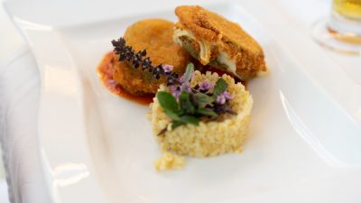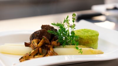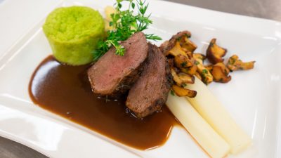 Das Fleischstück dann noch bei 58°C für 15 – 20 Minuten im Backrohr rasten lassen. Vor dem Anrichten den Hirschrücken noch einmal kurz in der Pfanne anbraten, in Tranchen schneiden und mit einer vorbereiteten Wildsauce und Beilagen am Teller platzieren.