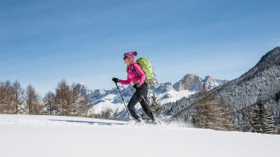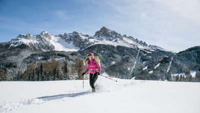 Im Eggental inmitten der Südtiroler Dolomiten sieht der Winter aus wie im Bilderbuch: ein Traum in Weiß für Skifahrer, Skitourengeher, Langläufer, Schneeschuhwanderer, Rodler und Ruhesuchende. Postkartengleich und schneegekrönt posieren die Bergketten Rosengarten und Latemar für die besten Urlaubsfotos. Stille umgibt den Karer See und den tief verschneiten Nadelwald.